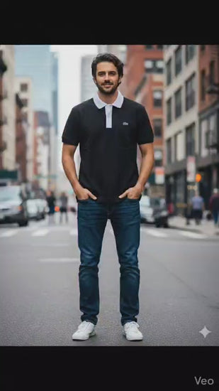 Polo de Piqué Lacoste negra, Corte Regular, Cuello acanalado con ribete en contraste